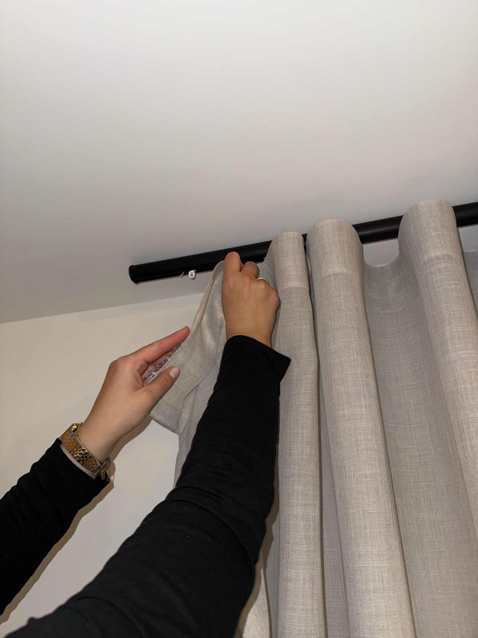 - Die Haken sind bereits an den Falten befestigt. Kontrolliere, dass alle Haken auf der gleichen Höhe eingestellt sind, damit der Vorhang sauber und gerade hängt. Falls nötig, kannst du die Haken vorsichtig nachjustieren.